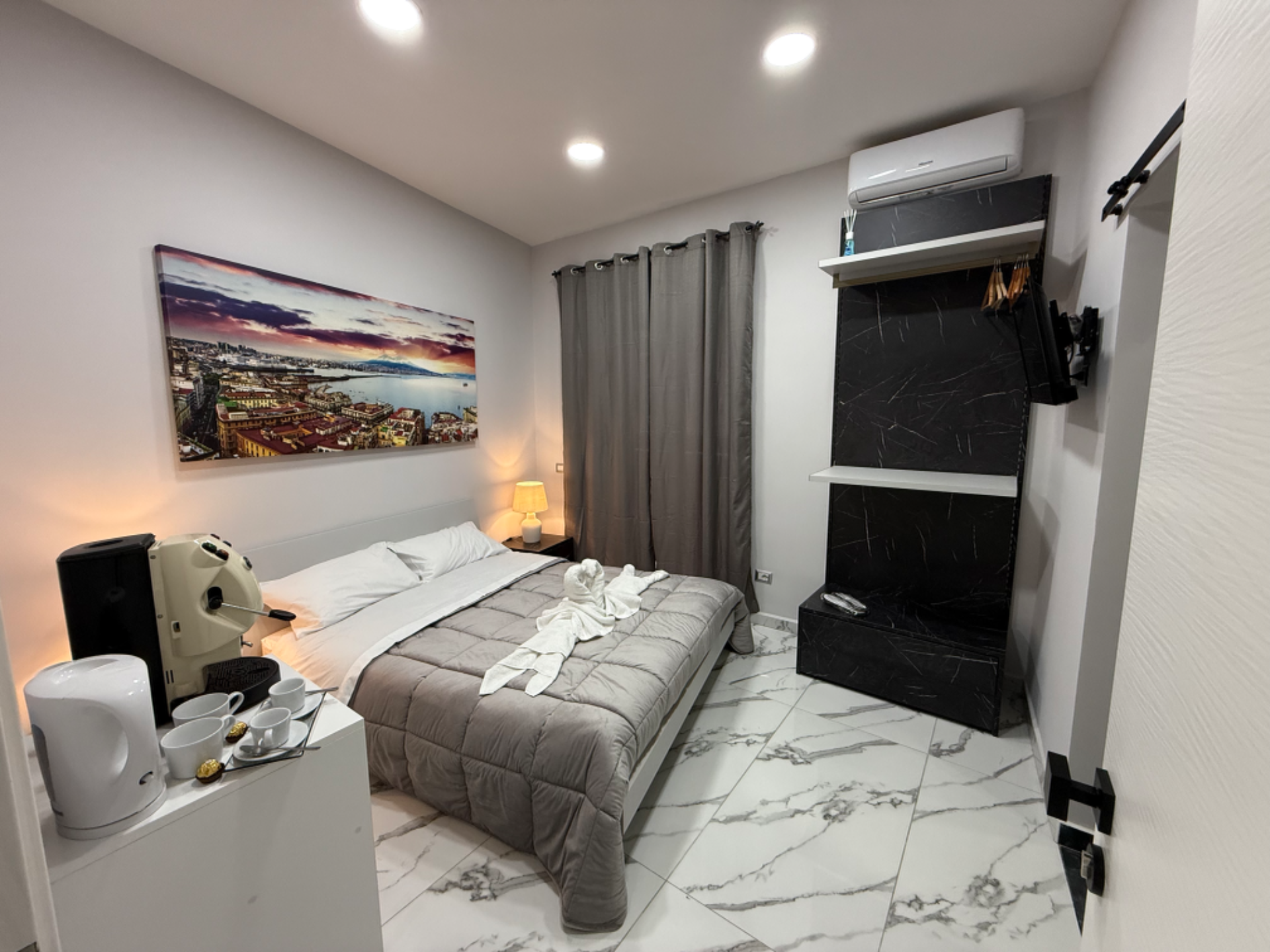 Oggi la tua camera è dotata di climatizzatore split silenzioso controllabile da telecomando, imposta la temperatura che ti fa sentire a tuo agio, attiva la modalità "night" per un sonno fresco e tranquillo, e spegni tutto con un click quando non è più necessario.